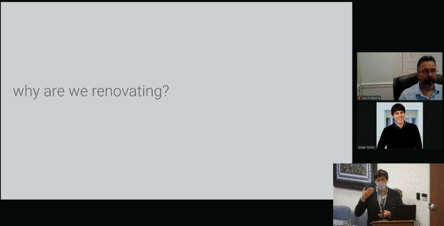 He then moved on to the explanation of the design. The first question they faced was whether to reuse the old building or start fresh. When they first got the Request for Proposal a year ago, they decided that if the building had good bones and was worth keeping that seemed like the right things to do.