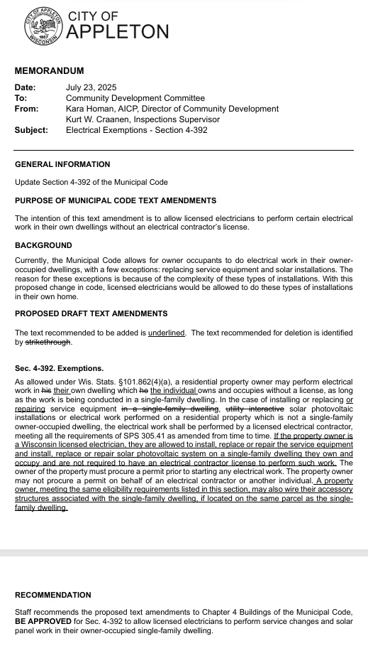 Community Development Committee Meeting 07/23/2025 – Will Vote On Updates To Municipal Code Regarding Electrical Exemptions And Inspections Supervisor’s Citation Authority