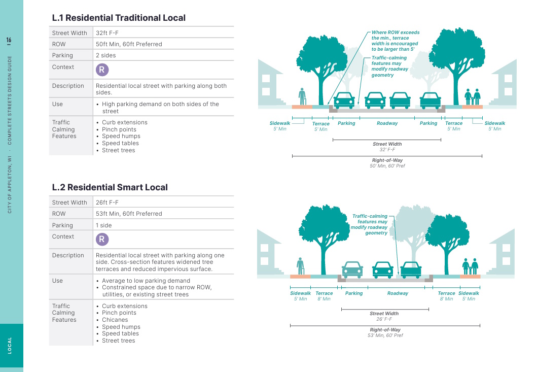 In April of 2024, the city adopted the Complete Streets design guide to govern its design decisions for reconstructing streets. Per the design guide, “Complete streets are multi-faceted and holistic streets that support multimodal transportation, active commerce, and vibrant communities. They meet the needs of a growing and thriving city by improving safety, enhancing access, and leading to even more growth in the community.” The design guide calls for local streets to have a width of 26 to 29 feet curb-to-curb with parking on only one side of the street.