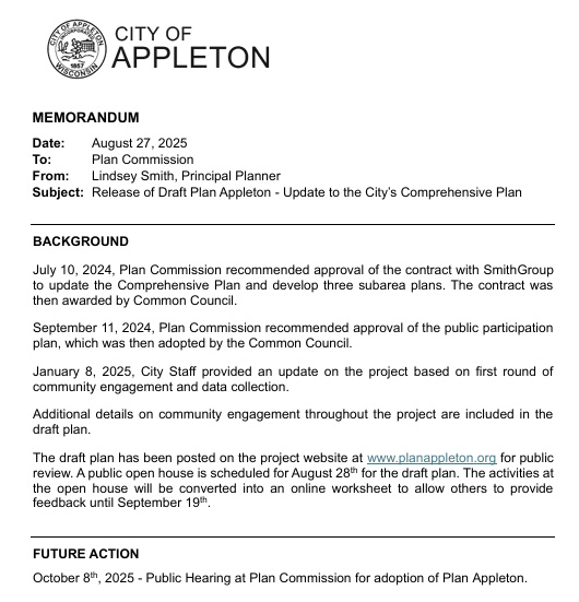 Finally, they will be reviewing the draft of the update to the city’s Comprehensive Plan. The draft plan is posted at www.planappleton.org for the public to review. The City Plan Commission will be holding a public hearing on the plan updates on 10/08/2025 with adoption of the plan to follow.